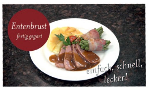 Zutaten: Entebrustfleisch, Trinkwasser,Rindfleisch(in Sosse),Rotwein,modifizierte Stärke,Tomaten,Gemüse,Nitritoökelsalz(Kochsalz,Konservierungsstoff E250), Milchzucker, Zwiebeln, Weizenmehl,Stärke, Hefeextrakt, Verdickungsmittel E415, Aromen,Gewürze, pflanzliches Eiweiß,Speck geräuchert, Karamell, Tomatenmark, Maltodextrin,Säuerungsmittel E330, Zucker, Antioxidationsmittel E301,Stabilisator E450 u. E452, Geschmacksverstärker E621, E627u. E631, Dextrose, Gewürzextrakte, Piment ganz,Lorbeerblätter,Farbstoff E150, Sellerie, Schwefeldioxid und Sulfite, Kann Spuren von Eier, Laktose, Senf enthalten.