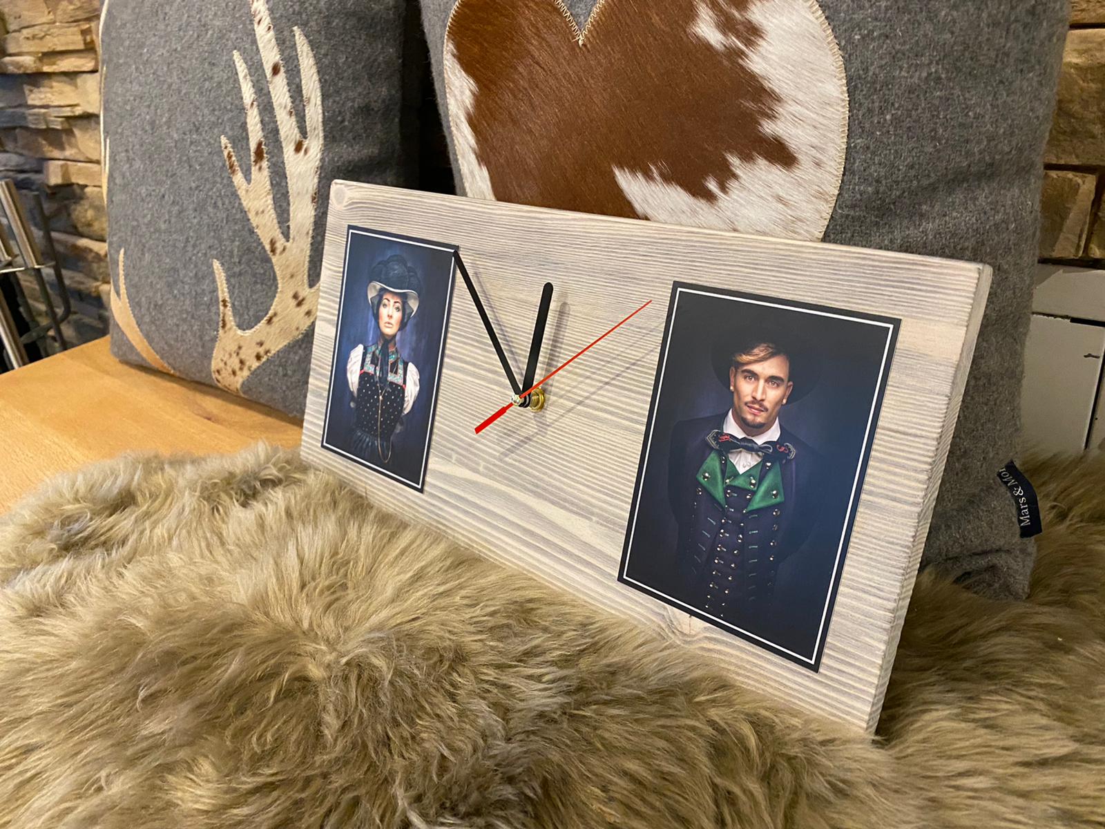Das bearbeitete Schwarzwaldbrett wurde mit einer leisen Quarzuhr und den Postkartenmotiven von Sebastian Wehrle versehen.