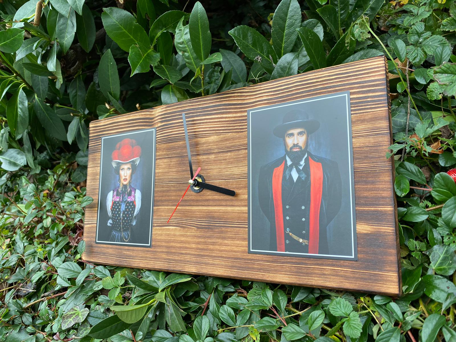 Das bearbeitete Schwarzwaldbrett wurde mit einer leisen Quarzuhr und den Postkartenmotiven von Sebastian Wehrle versehen.