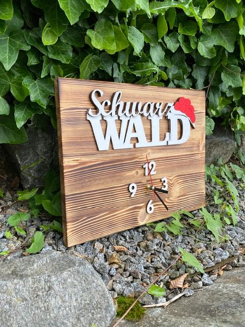 Das bearbeitete Schwarzwaldbrett wurde mit einer leisen Quarzuhr und einem tollen Schwarzwald Schriftzug versehen.