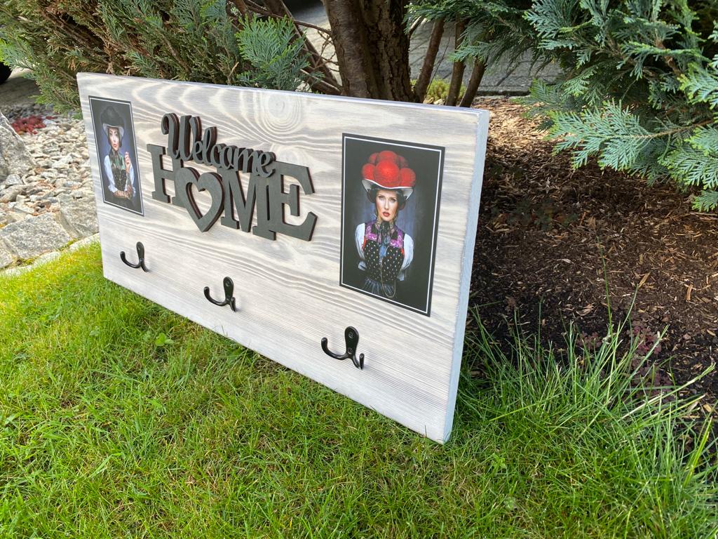 Dekoratives Schlüsselbrett aus bearbeitetem Kiefernholz mit drei Doppel Schlüsselhaken und einem tollen Schriftzug.