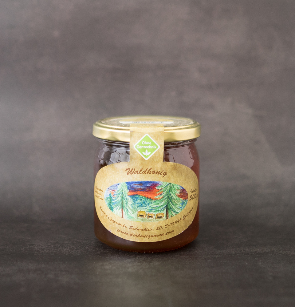 Waldhonig gilt als der beliebteste Honig in Deutschland überhaupt. Er ist köstlich und zudem sehr gesund, da er die höchsten Anteile an Enzymen und Mineralstoffen unter den Sortenhonigen enthält. Die Bienen sammeln dazu den ausgeschiedenen Honigtau von Fichten-, oder Tannenläusen im schönen Schwarzwald. Der Geschmack ist sehr kräftig und herb mit einem malzigen Ton, der zum vollen Aroma beiträgt und es abrundet. Seine Farbe ist rotbraun, die Konsistenz dickflüssig. Köstlich – morgens auf frischem Brot oder einfach als Genuss zwischendurch.