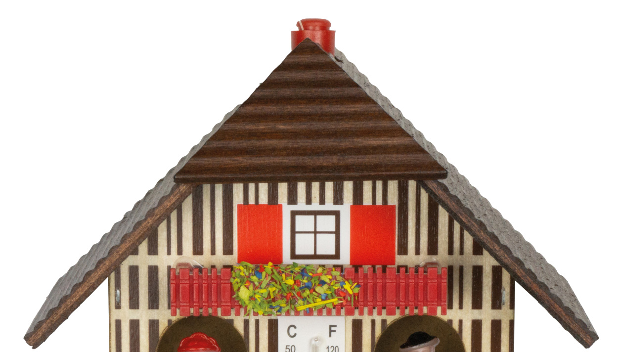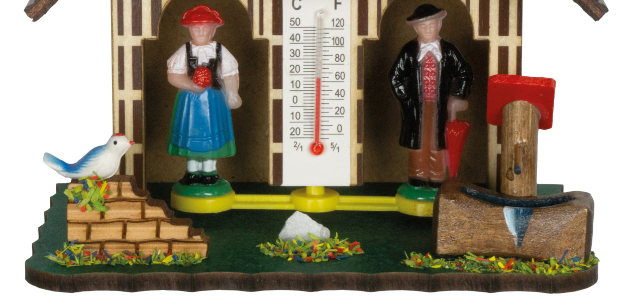 Im Inneren des Wetterhäuschens befindet sich ein Strang fein gespannter Haare. Diese reagieren empfindlich auf Veränderungen der Luftfeuchtigkeit und verdrehen sich dabei. Bei trockener Luft ist so die Frau im Sommerkleid vor dem Häuschen und bei feuchter Luft erscheint der Mann mit Regenschirm.