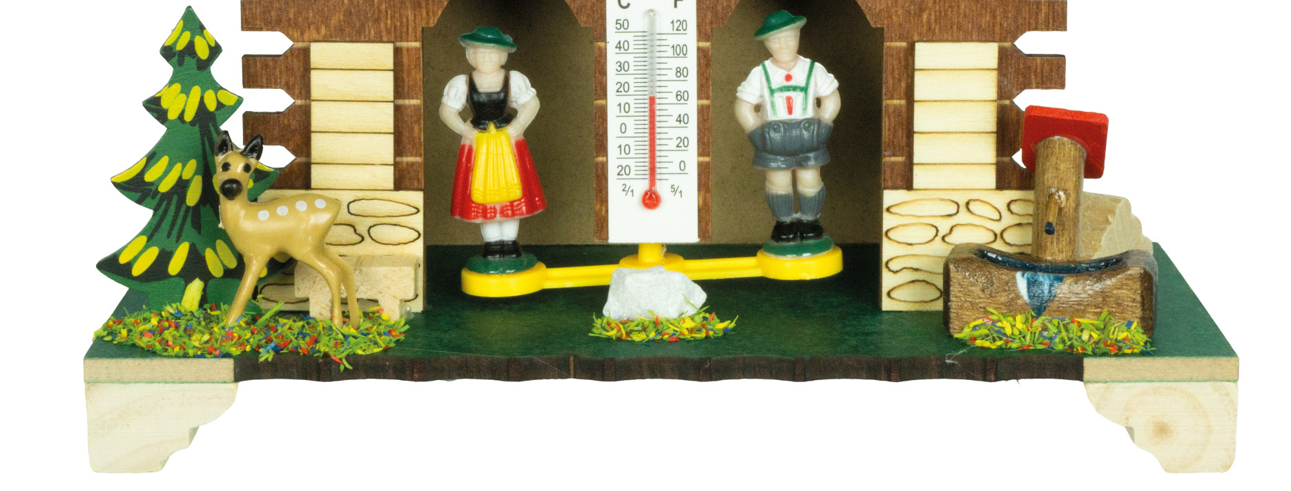 Im Inneren des Wetterhäuschens befindet sich ein Strang fein gespannter Haare. Diese reagieren empfindlich auf Veränderungen der Luftfeuchtigkeit und verdrehen sich dabei. Bei trockener Luft ist so die Frau im Sommerkleid vor dem Häusschen und bei feuchter Luft erscheint der Mann mit Regenschirm.
