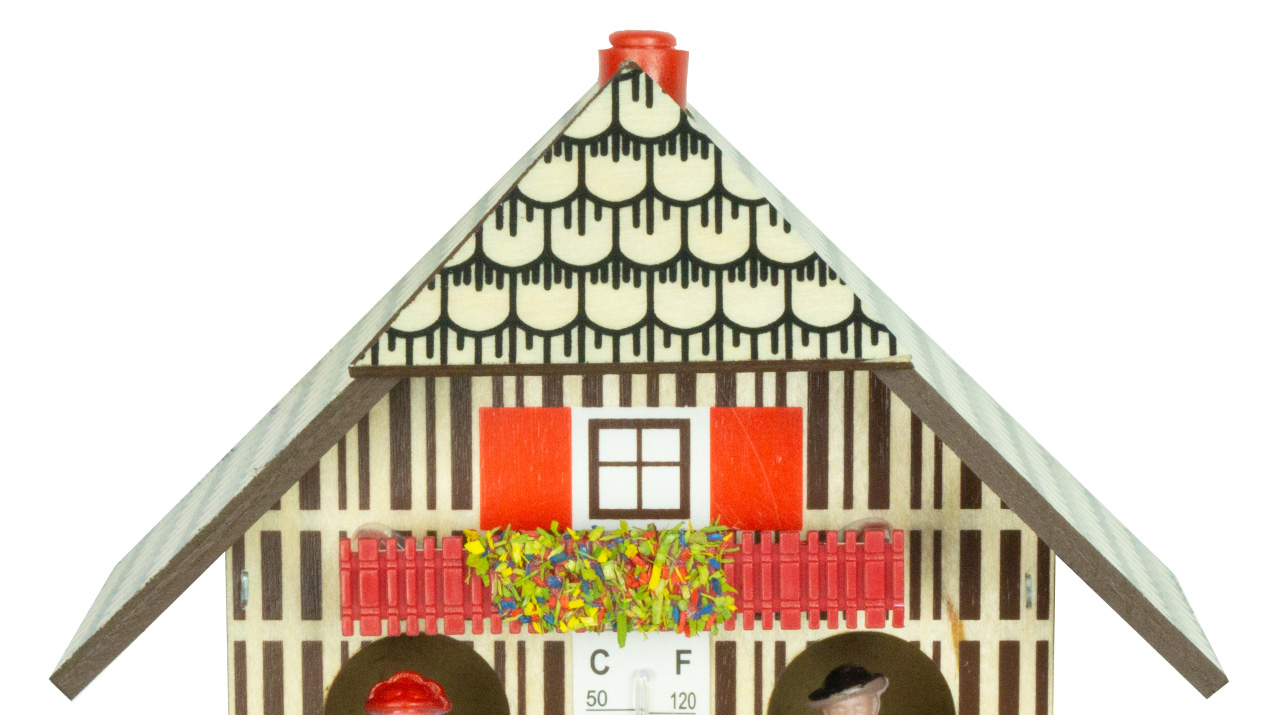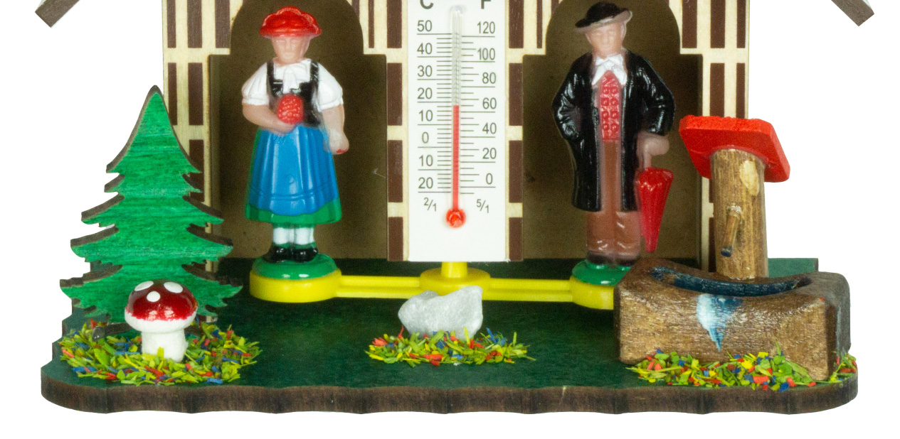 Im Inneren des Häuschens befindet sich ein Strang fein gespannter Haare, die sich bei Veränderungen der Luftfeuchtigkeit gegeneinander verdrehen. Bei schönem Wetter erscheint eine Schwarzwälderin im Sommerkleid, bei Regen ein Mann mit Regenschirm.